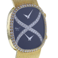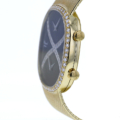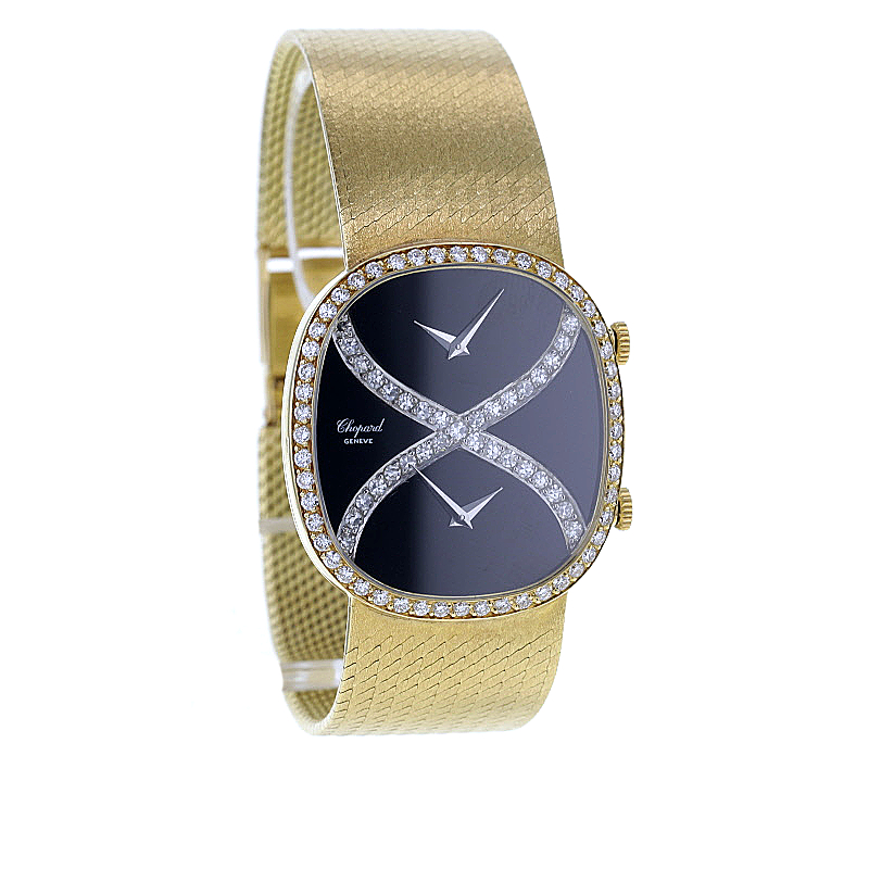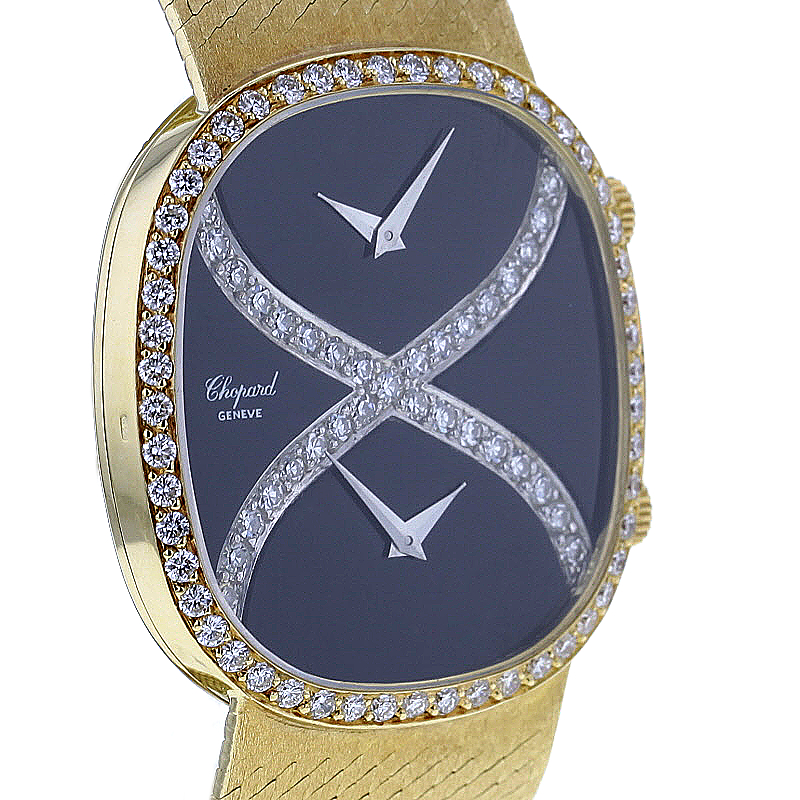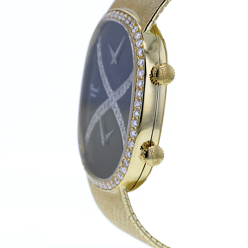 Das Gehäuse besteht aus 18 kt Gelbgold und präsentiert sich in einer harmonischen Ellipse, die dem Modell eine zeitlose, elegante Ausstrahlung verleiht. Das Zifferblatt ist Schwarz und erinnert an die klassische Dual-Time-Philosophie von Chopard: zwei Zeitzonen übersichtlich lesbar. Auf dem Blatt ziehen Diamantenbesatz im wahrsten Sinne Glanzpunkte, die dem Ganzen einen dezenten, luxuriösen Touch verleihen.