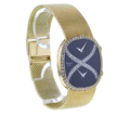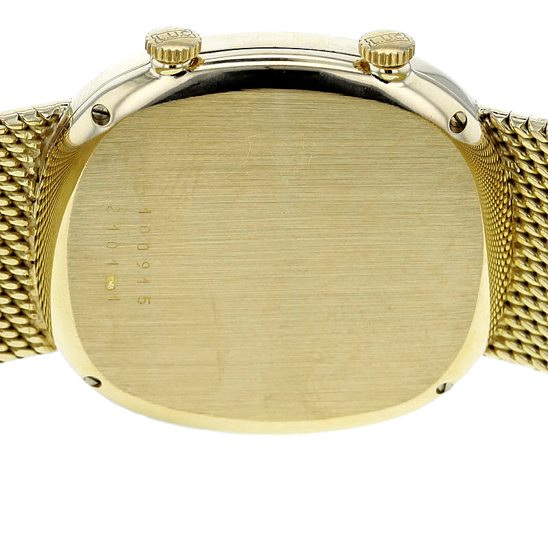 Die Uhr verfügt über einen Handaufzug und das Kaliberwerk 2442, das eine zuverlässige Anzeige zweier unterschiedlicher Zeiten ermöglicht. Die Gehäuse-Lünette und das Armband sind ebenfalls in 18 kt Gelbgold gehalten, wodurch ein stimmiges Gesamtbild entsteht. Die Bandbreite von 20 mm sorgt trotz der feinen Proportionen für einen sicheren Halt am Handgelenk. Tragelänge ca. 18 cm, ideal für eine individuelle Passform.