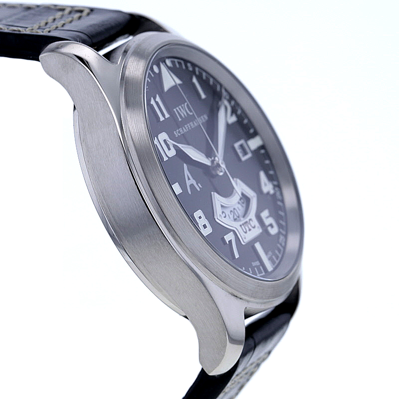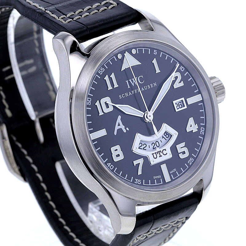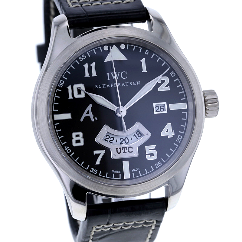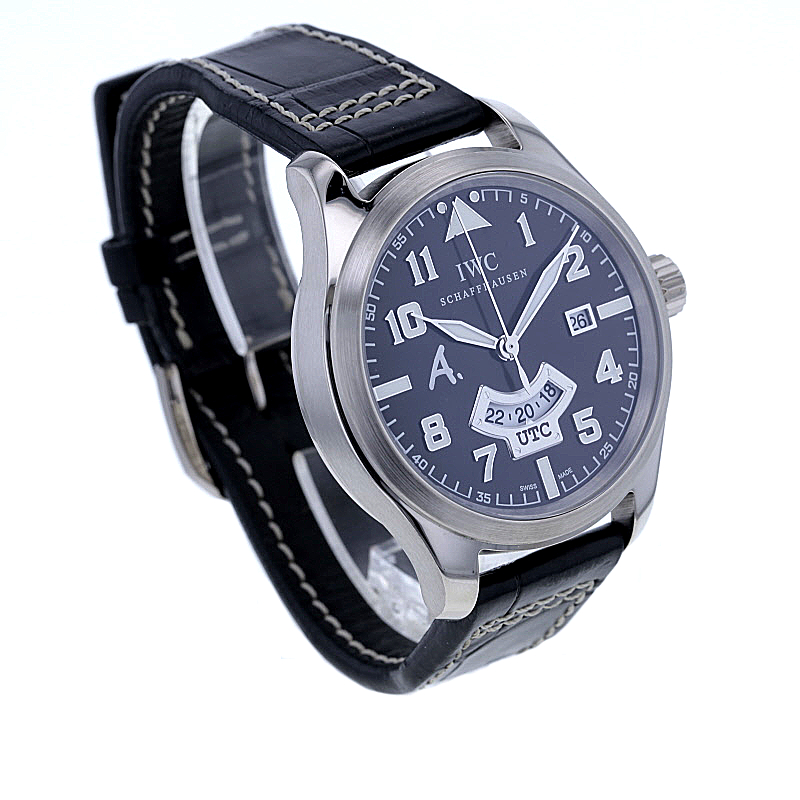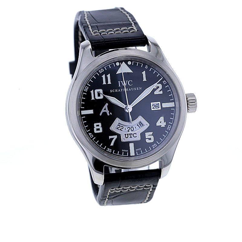 IWC Pilot´s Watch UTC „Antoine de Saint Exupéry“ limited Edition im 44 mm Gehäuse aus Weißgold 750/-. Es wurden nur 250 Exemplare weltweit gefertigt. Dunkelbraunes Zifferblatt mit dem typischen „A.“ Logo und arabischen Ziffern mit Lumineszenz. Zeiger in Blattform ebenfalls mit Lumineszenz. Kratzunempfindliches Saphirglas widersteht Druckabfall. Mechanisches Uhrwerk, Kaliber 70710, mit automatischem Aufzug und Anzeige von Datum und einer zweiten Zeitzone, UTC. Verschraubbare Aufzugkrone und verschraubter Gehäuseboden. Wasserdicht bis zu einem Druck von 6,0 bar, ~ca. 60 Meter Tiefe. Weicheisen-Innengehäuse zum Schutz gegen Magnetfeldstrahlung. Original braunes Alligator-Lederband mit IWC Dornschließe. Die Uhr stammt ca. aus dem Jahre 2008. Die original Box ist vorhanden. Die Uhr wurde vom Uhrmachermeister geprüft und gewartet und vom Polisseur fachmännisch aufgearbeitet. Sie erhalten 12 Monate Gewährleistung über uns.